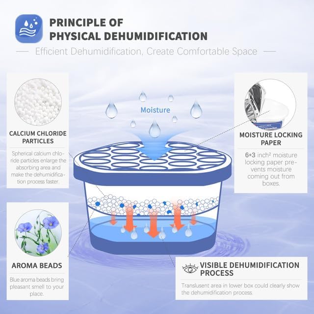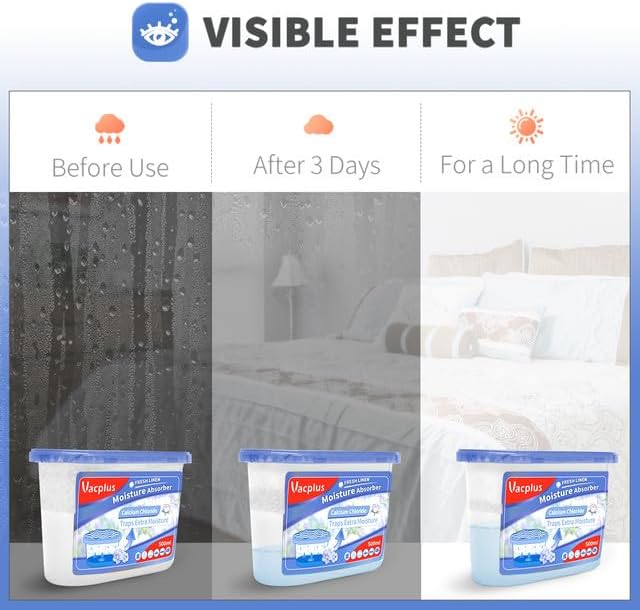 - Efficient Dehumidification: Traps excess moisture quickly. Vacplus moisture absorbers use spherical calcium chloride to enlarge the absorbing area. The large collecting capacity of this moisture remover keeps a long time dry.