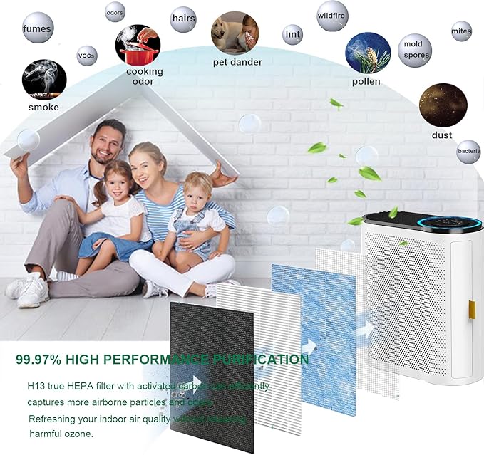 - Premium MK04 air filter H13 True HEPA removes up to 99.97% of airborne particles as small as 0.3 microns like dust, cigarettes smoke, bacteria, mold spores, etc. Activated carbon filter is effective at reducing odor and harful gas to keep your place fresh and odor-free