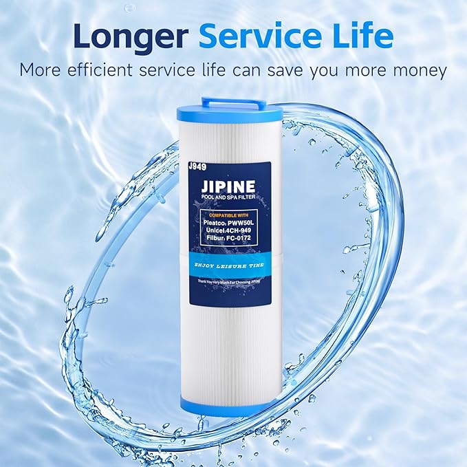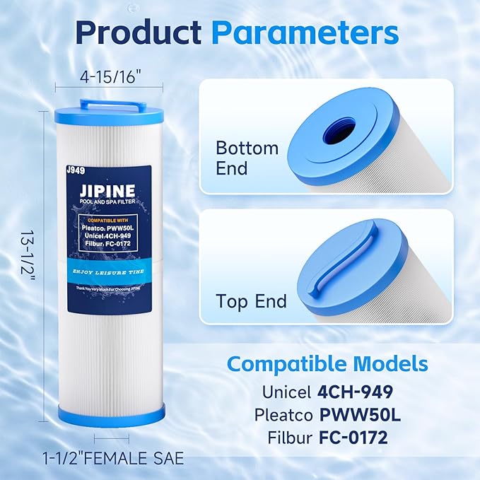 - 【Compatible Models】JIPINE 4CH-949 Length: 13 1/2"; Outer Dimension: 4 15/16"; Top: handle; Bottom: 1 1/2" FEMALE SAE . Filtration Area: 50 sq.ft. Replacement for Pleatco PWW50L, FIL50-5D13H15FCT-3, Filbur FC-0172, SD-01143, 817-4050, Compatible for Waterway Teleweir 50, Rising Dragon 50, NOTE: This is a compatible spare part and the manufacturers' names and part numbers have been used for reference purposes only. JIPINE is an independent brand.