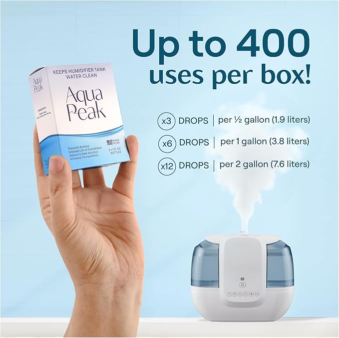 - KEEP YOUR HUMIDIFIER CLEAN EASILY: Aqua Peak's humidifier drops make cleaning your humidifier a breeze. Just add these drops to any model – cool mist, warm mist, ultrasonic, or impeller – and extend the time between cleanings. Perfect for all makes and models!