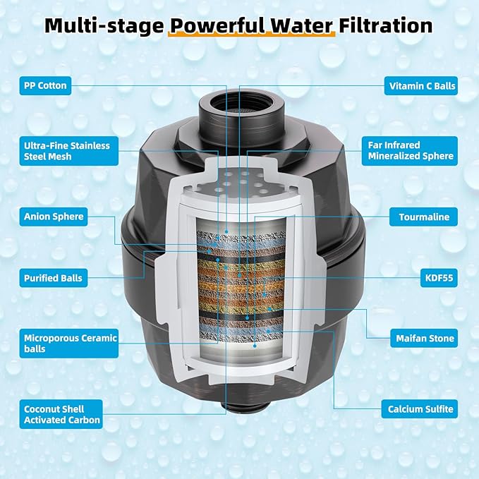 - [20 Stages Shower Filter] Immerse yourself in the luxury of the 20-stage shower filter, featuring a water purification system with redox media, calcium sulfite, activated carbon, and ceramic beads for exceptional filtration. Experience the elimination of odors, pH level balancing, and the infusion of beneficial minerals that nourish your skin, nails, and hair right from the initial use. This filter not only cleanses and moisturizes but also offers unparalleled care for sensitive skin.