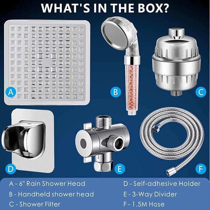 - HEALTH CARE SHOWER SYSTEM - Our high flow showerhead is made of food grade ABS material, Can filter soft water, Shower set includes: 6" square shower head, 3 spray hand held shower, 23 layer filter with cartridge, 59" hose, 3-way diverter, self-adhesive bracket, flow restrictor, Teflon tape.