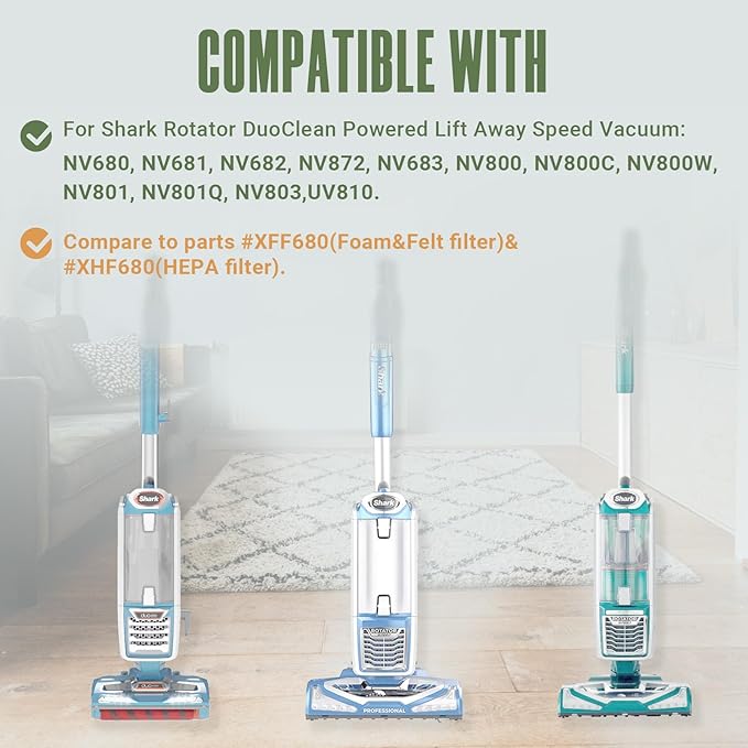 - Compatible Devices : Compare to parts #XFF680(Foam&Felt filter)& #XHF680(HEPA filter), Shark Rotator DuoClean Powered Lift Away Speed Vacuum NV680, NV681, NV682, NV872, NV683, NV800, NV800C, NV800W, NV801, NV801Q, NV803,UV810 Compare to parts #XFF680(Foam&Felt filter)& #XHF680(HEPA filter), Shark Rotator DuoClean Powered Lift Away Sp… See more