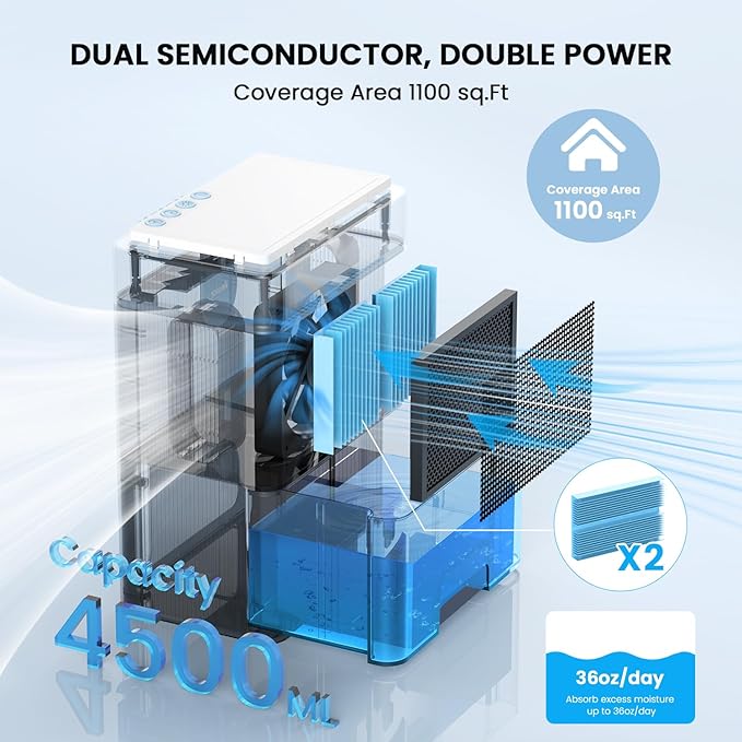 - [High Efficiency Home Dehumidifier] VEWIOR dehumidifier utilizes dual-core semiconductor condensing technology to provide powerful dehumidification. At 86°F and 80% relative humidity, the large dehumidifier effectively absorbs up to 1060ml/36oz of moisture per day. Suitable for room, basement, bedroom, bathroom, closet, office, garage, kitchen, laundry room, storage room.
