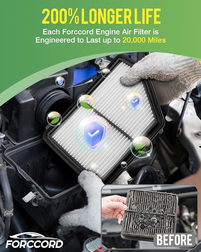 - 【 200% Longer Life】 Compare with Standard air filter, we adopts advanced HV filter paper with higher filtering precision, to absorb 99.9% of impurities (hair,fines,dust and flocs etc.).For the service life, each engine air filters are engineered to last up to 20,000 miles, 200% longer than the standard performance, less replacement.