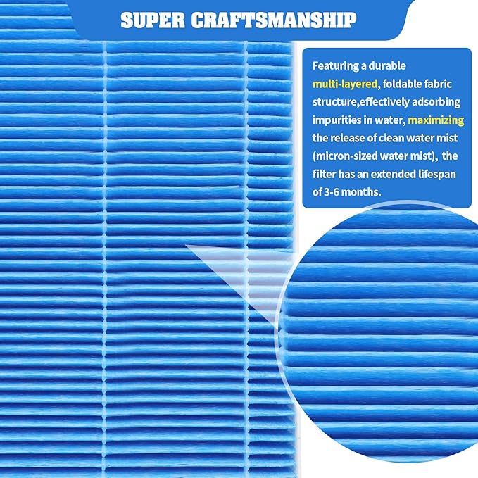 - Function: This blue humidifier filter features a durable multi-layer foldable fabric construction that maximizes moisture absorption.The white sponge filter traps and filters fine impurities and sediments from the water, reducing water hardness