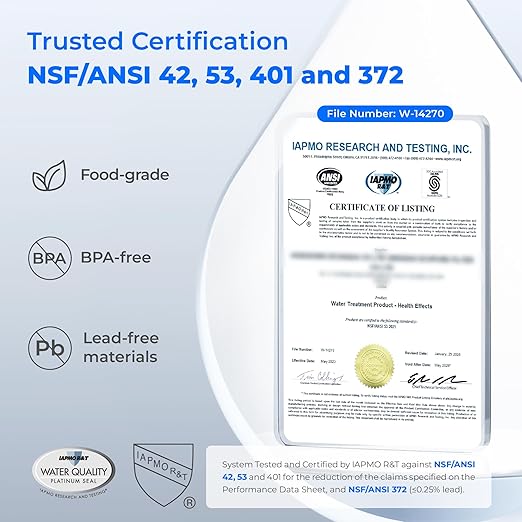 - NSF/ANSI Certified: The electric water filter dispenser has been certified by IAPMO against NSF/ANSI 401, 53, 42 and 372 standards to reduce over 45 contamintants, including chlorine, lead, microplastic, mercury, benzene and more. Third-party lab tests confirmed its capability to reduce PFOA and PFOS, thus ensuring high-quality drinking water.