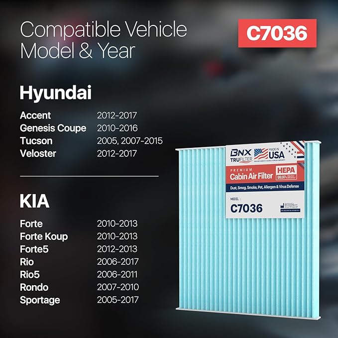 BNX TruFilter C7036 Cabin Air Filter, HEPA 99.97%, Compatible With Hyundai Accent, Genesis Coupe, Tucson, Veloster, Kia Forte, Forte Koup, Forte5, Rio, Rio5, Rondo, Sportage