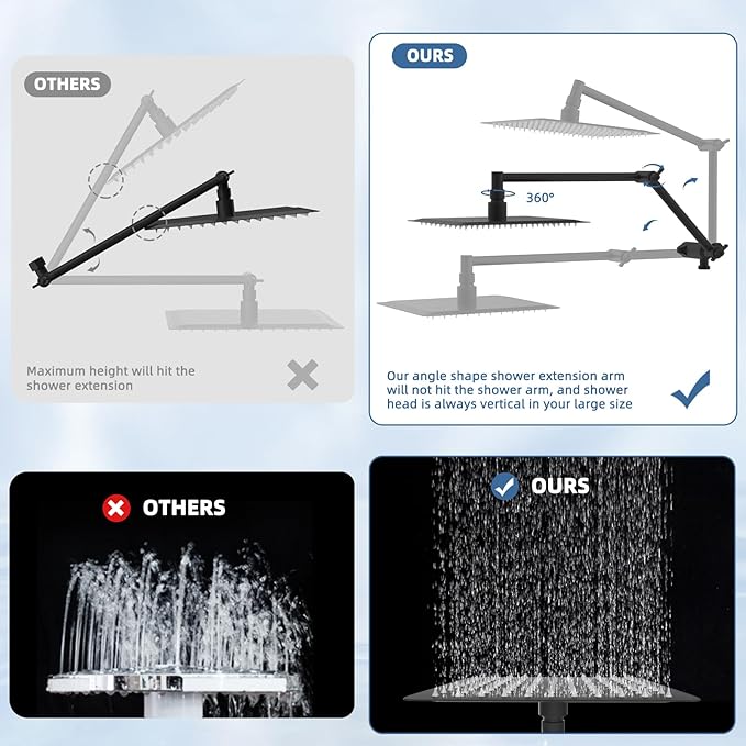 - Upgraded Metal 3-Way Diverter & Shower Hose: Our 3-way diverter allows you to switch between a handheld spray or rain showerhead individually or enjoy the luxury of double showerheads simultaneously. Unlike ordinary ones, ours seamlessly connects to the shower extension arm, eliminating leak, secure shower experience. The stainless steel 71-inch shower hose is made of odorless EPDM material and can be used in high-temperature environments, offering maximum durability and flexibility
