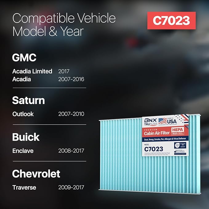 BNX TruFilter C7023 Cabin Air Filter, HEPA 99.97%, Compatible With GMC Acadia, Acadia Limited, Chevrolet Traverse; Saturn Outlook; Buick Enclave