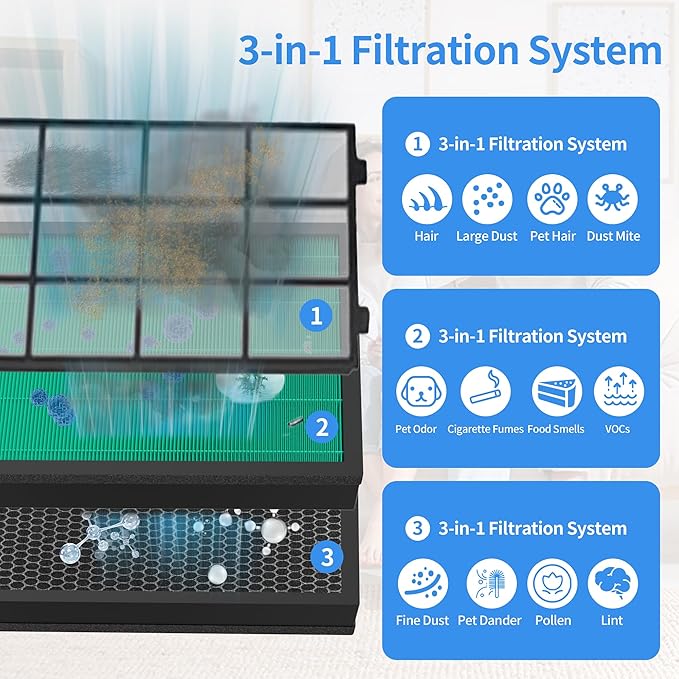 - High-Efficiency Filtration: This 400/400S air purifier filter set for Coway is equipped with high-efficiency filtration system. The Green True HEPA filter efficiently captures 99.99% of airborne particles as small as 0.01 microns in the air, while the activated carbon filter absorbs unpleasant odors from pet, smoke, cooking smell and VOCs.