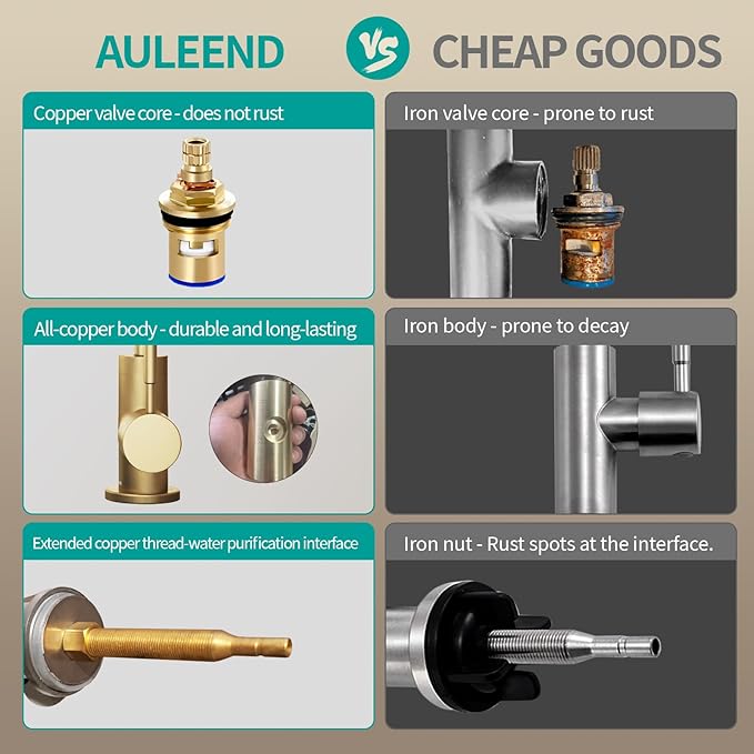- 【Leadless brass】The design features a premium metal construction for the faucet body and handles, ensuring reliability. The finishes are resistant to corrosion and tarnishing from everyday use. The water outlet gathers water together and minimizes splashing, providing a smooth flow of tap water.