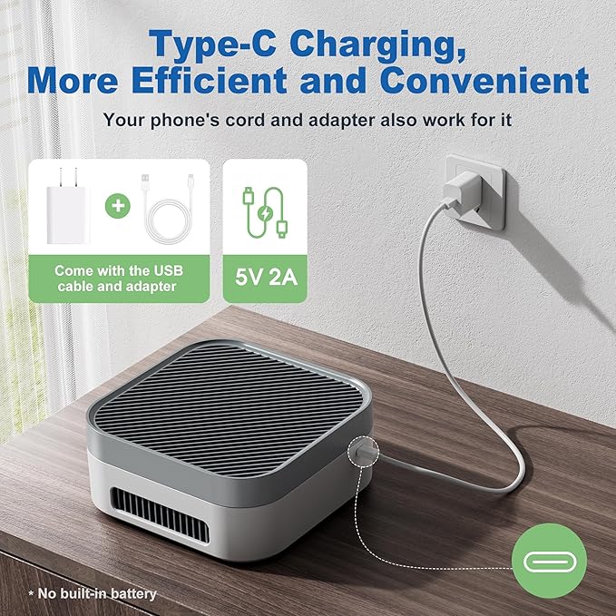 - Type-C Charging and Smart Touch: The popular Type-C Charging makes this HEPA air purifier more outstanding. Your phone's cord and adapter also work for it. Say goodbye to complex and useless features, we make this air purifier easier to operate with 1/2/3 Speeds and a 2H/4H/8H timer smart touch screen. Guard your sweet nights well. Also bring energy-saving and effective timed purification to your home or office when you are out.