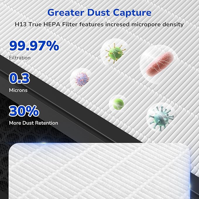 - High-Efficiency HEPA Filter: H13 True HEPA filter replacement for LEVOIT Vital 200S features upgraded microporous structure that boosts particle retention by 30% compared to general filters, capturing 99.97% of airborne particles down to 0.3 microns