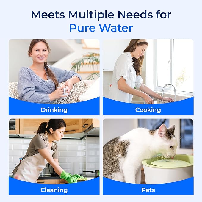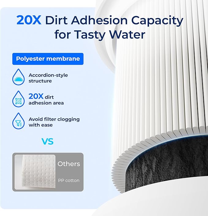 - 𝟐𝟎𝐗 𝐃𝐢𝐫𝐭 𝐀𝐝𝐬𝐨𝐫𝐩𝐭𝐢𝐨𝐧 𝐂𝐚𝐩𝐚𝐜𝐢𝐭𝐲: With the polyester membrane of the accordion-style structure, this under sink water filter has a 20X dirt adhesion area, efficiently intercepts sand, large particles, sediments and tiny impurities, tested by a third-party lab, and can avoid filter clogging with ease.