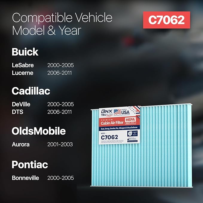 BNX TruFilter C7062 Cabin Air Filter, HEPA 99.97%, Compatible With Cadillac; DeVille, DTS; Oldsmobile Aurora; Buick: LeSabre, Lucerne; Pontiac: Bonneville