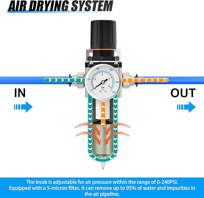 - 【Air Filter】The filter is fitted with a 5 micron cartridge which effectively filters out 95% of particles and water from the air.
