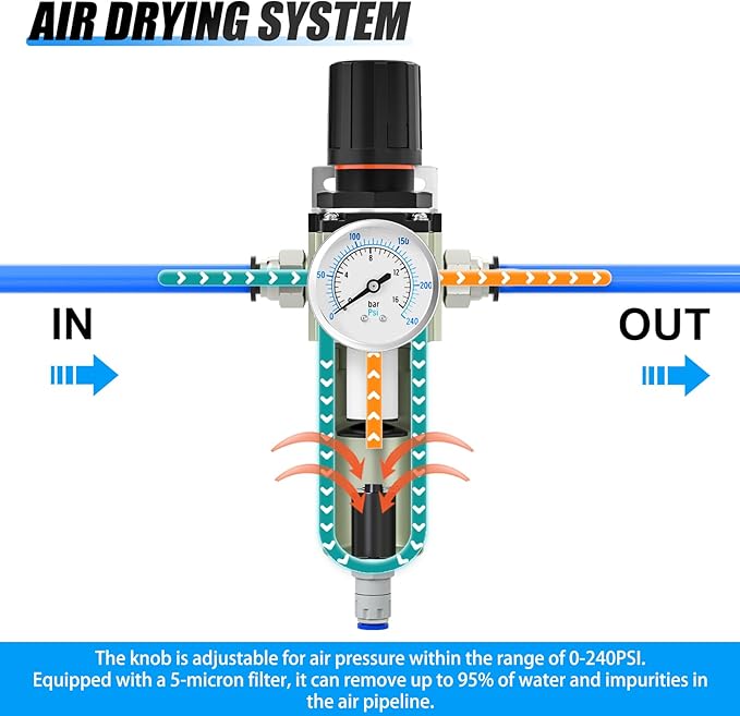 - 【Air Filter】The filter is fitted with a 5 micron cartridge which effectively filters out 95% of particles and water from the air.