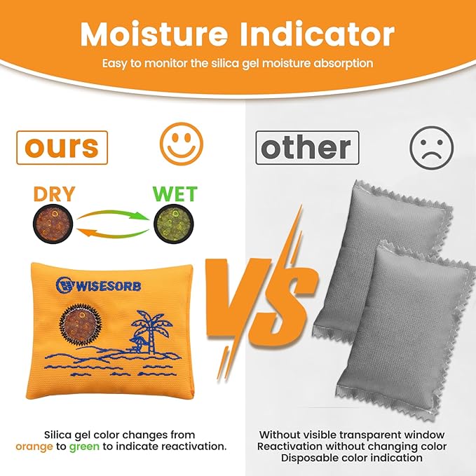 - 【Indicating Silica Gel Beads】: Wisesorb cobalt chloride-free orange indicating beads (2-4mm in size) are designed to change color within a humidity range of 20%-50%. Once saturated with moisture, the beads will complete the color change to LIGHT green. It's important to note that the initial color change does not indicate full saturation. The beads will continue to absorb moisture until reaching 50%RH. We recommend periodically checking the silica gel beads to ensure their effectiveness.