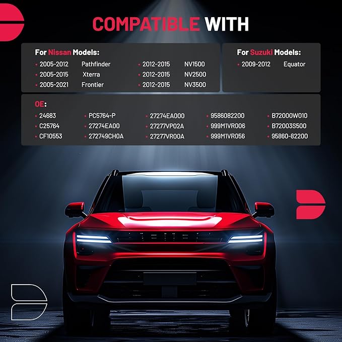 - 【Compatible Replacement】Compatible with Nissan Models: 2005-2012 Pathfinder, 2012-2015 NV1500, 2005-2015 Xterra, 2012-2015 NV2500, 2005-2021 Frontier, 2012-2015 NV3500; Compatible with Suzuki Models: 2009-2012 Equator