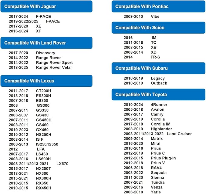 - 【Compatible with】- For 2017-2024 Jaguar F-PACE,2019-2022/2024 I-PACE,2017-2020 XE,2016-2024 XF,2017-2020 Land Rover Discovery,2011-2017 Lexus CT200H,2013-2018 ES300H,2007-2018 ES350,2010-2023 GX460,2008-2011/2013-2021 LX570,2015-2017 NX200T,2018-2021 NX300,2015-2021 NX300H,2016 Scion IM,2011-2016 Scion TC,2008-2015 Scion XB,2008-2014 Scion XD,2010-2019 Subaru Legacy,2010-2019 Outback,2010-2024 Toyota 4Runner,2007-2017 Camry,2009-2019 Corolla,2017-2018 Corolla IM,2008-2019 Highlander,2013-2022 Land Cruiser,2016-2020 Mirai,2010-2016 Prius,2006-2018 RAV4,2008-2022 Sequoia,2011-2020 Sienna,2007-2021 Tundra,2009-2016 Venza,2006-2018 Yaris - Verify fitment by Using Amazon Part Finder.