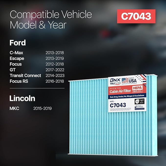 BNX TruFilter C7043 Cabin Air Filter, HEPA 99.97%, MADE IN USA, Compatible With Ford C-Max, Escape, Focus, GT, Transit Connect, Lincoln MKC
