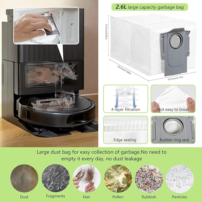 - High cost performance:Includes 2 Main Brush Roller,6 Black Side Brush,4 Hepa Filters,8 Mop Pads,6 Dust Bags,1cleaner brush, 1 water tank brush,1 screwdriver ,29pcs