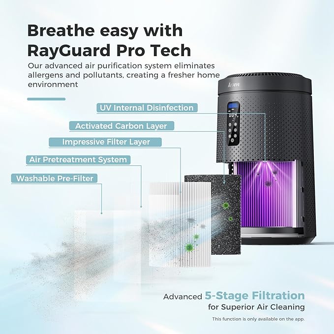 - Smart Control for Healthier Homes: The AROEVE MK09W air purifier offers both app and voice control for easy operation. Users can adjust settings via smartphone or voice commands, enhancing convenience, especially for busy lifestyles. With app control, you can conveniently select purification modes, set timers or other setting, ensuring optimal air quality and health protection for the family.