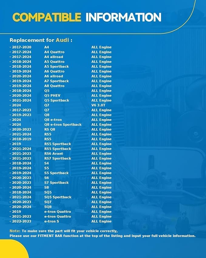 - Compatible List: The air filter fit for AUDI A4 2017-2025, A4 ALLROAD 2017-2025, A5 2018-2025, A6 2019-2025, A6 ALLROAD 2020-2025, A7 2019-2025, A8 2019-2025, E-TRON 2019-2023, Q5 2018-2025, Q7 2017-2025, Q8 2019-2025, Q8 E-TRON 2024, RS Q8 2020-2024, RS5 2018-2025, RS6 2021-2025, RS7 2021-2025, S4 2018-2025, S5 2019-2025, S6 2020-2025, S7 2020-2025, S8 2020-2025, SQ5 2018-2025, SQ7 2020-2025, SQ8 2020-2025, SQ8 E-TRON 2024, PORSCHE CAYENNE 2019-2025