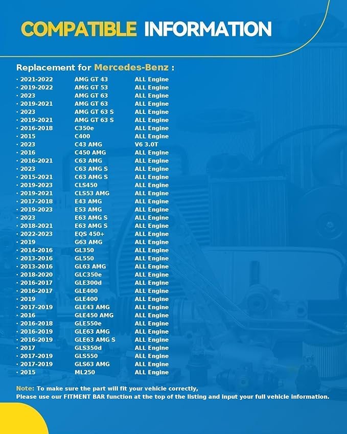 - Compatible List: The air filter CF11719 fit for Mercedes-Benz AMG GT 43 2021-2024, AMG GT 53 2019-2024, AMG GT 63 2019-2023, C300 2015-2024, C350e 2016-2018, C400 2015, C43 AMG 2017-2025, C450 AMG 2016, C63 AMG 2015-2025, CLS450 2019-2023, CLS53 AMG 2019-2023, E300 2017-2019, E350 2020-2023, E400 2018, E43 AMG 2017-2018, E450 2019-2023, E53 AMG 2019-2023, E63 AMG 2018-2023, EQS 450+ 2022-2023, EQS AMG 2022-2023, G550 2019-2023, G63 AMG 2019, GL350 2014-2016, GL450 2015-2016, GL550 2013-2016, GL63 AMG 2013-2016, GLC350e 2018-2020, GLC43 AMG 2017-2022, GLC63 AMG 2018-2021, GLE300d 2016-2017, GLE350 2016-2018, GLE350d 2016, GLE400 2016-2019, GLE43 AMG 2017-2019, GLE450 AMG 2016