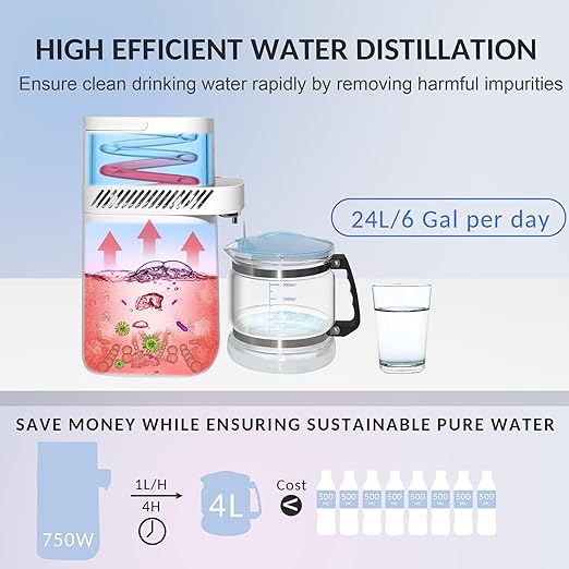 - 【Fast & Cost-Effective Distillation】Equipped with a 750W heating element, this water distiller produces up to 0.3 gallons (1L) per hour or 6 gallons per day. Ideal for home or office use, it offers a cost-effective alternative to bottled water—clean, fresh, and always ready.