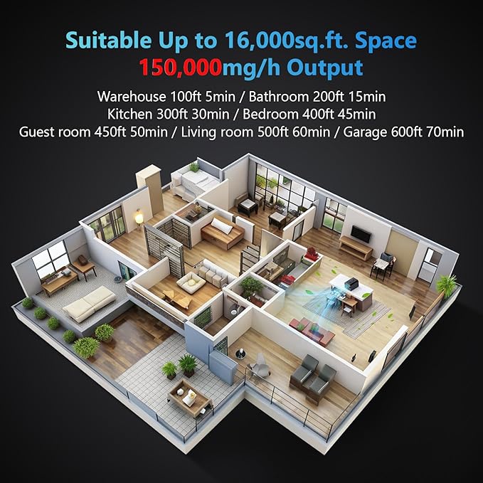- 150,000 mg/h High Output: Our commercial ozone generator produces 150,000 mg/h, 3.7 times more than standard machines, ensuring fast and effective disinfection, odor neutralization, and sanitization for large spaces