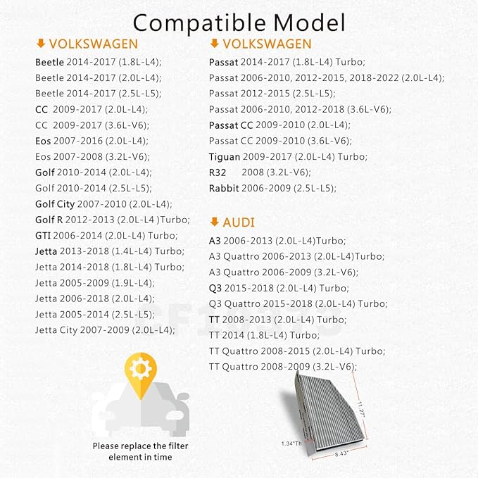 - Cabin air filter is suitable for Compatible with Volkswagen Passat 2014-2017 (1.8L-L4) Turbo; Passat 2006-2010, 2012-2015, 2018-2022 (2.0L-L4); Passat 2012-2015 (2.5L-L5); Passat 2006-2010, 2012-2018 (3.6L-V6); Passat CC 2009-2010 (2.0L-L4); Passat CC 2009-2010 (3.6L-V6); Volkswagen Tiguan 2009-2017 (2.0L-L4) Turbo; Volkswagen R32 2008 (3.2L-V6); Volkswagen Rabbit 2006-2009 (2.5L-L5); Audi A3 2006-2013 (2.0L-L4)Turbo; A3 Quattro 2006-2013 (2.0L-L4)Turbo; A3 Quattro 2006-2009 (3.2L-V6); Audi Q3 2015-2018 (2.0L-L4) Turbo; Q3 Quattro 2015-2018 (2.0L-L4) Turbo; Audi TT 2008-2013 (2.0L-L4) Turbo; TT 2014 (1.8L-L4) Turbo; TT Quattro 2008-2015 (2.0L-L4) Turbo; TT Quattro 2008-2009 (3.2L-V6);