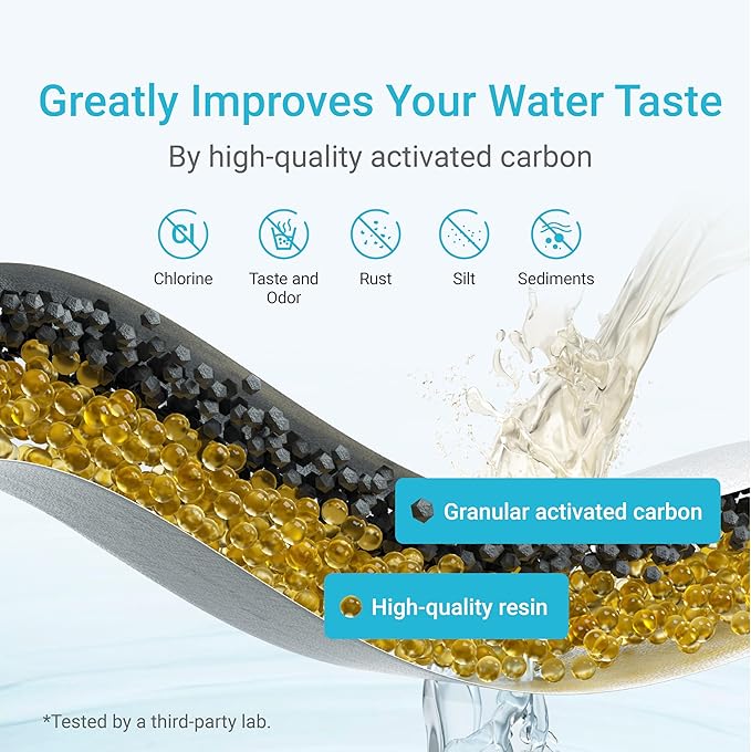 - ๐๐๐๐๐๐ญ๐ข๐ฏ๐ ๐๐ข๐ฅ๐ญ๐ซ๐๐ญ๐ข๐จ๐ง ๐ฉ๐๐ซ๐๐จ๐ซ๐ฆ๐๐ง๐๐: Efficient and precise filtration with granular activated carbon and high-quality resin. Reduces chlorine, odors, rust, silt, and sediment for clean and healthy water.(The data come from a third-party lab.)