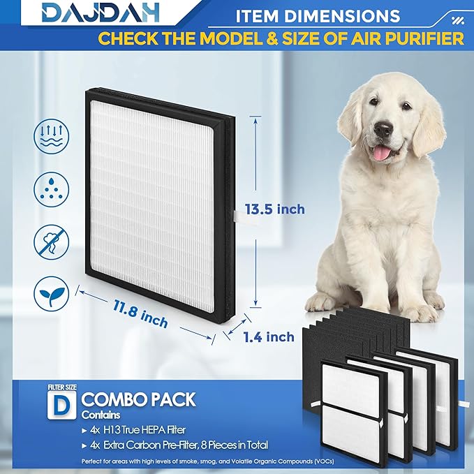 - [ ππππ-ππππππππ‘ππ¬ πππ― π§π₯π¨π πππ£π ππππ§ππ₯ ]: DAJDAH IAF-H-100D HEPA Filter D is a high-performance particle filter. H13 True HEPA layer can completely capture 99.97% of particles, such as pet dander, fineDust, smoke particles, etc. Upgraded ActivatedCarbon pre-filter contains more high-quality carbon to absorb petOdors, smoke, cooking smells and AdverseVOCs, captures large particles in the air, effectively protecting and extending the life of the HEPA filter