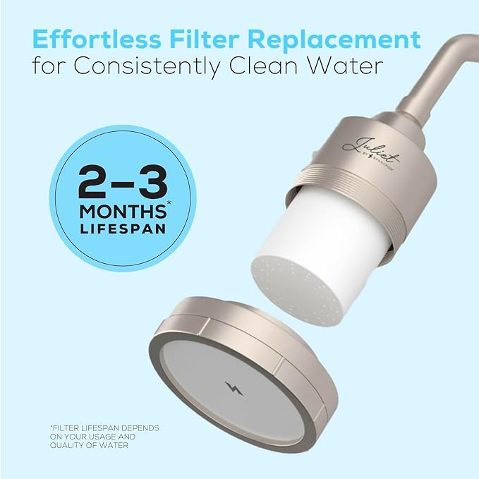 - ELEGANT DESIGN & EASY INSTALLATION: Juliet’s shower head filter features a sleek, modern look with effortless installation. The replaceable filter cartridges last 2-3 months, ensuring consistently cleaner water with every shower