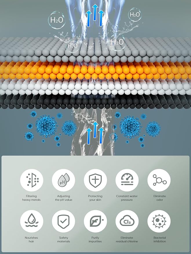 - Product Benefits : Removes heavy metals and chlorine, improves skin and hair, maintains water pressure, and is easy to install and replace. Removes heavy metals and chlorine, improves skin and hair, maintains water pressure, and is easy to install and replace.