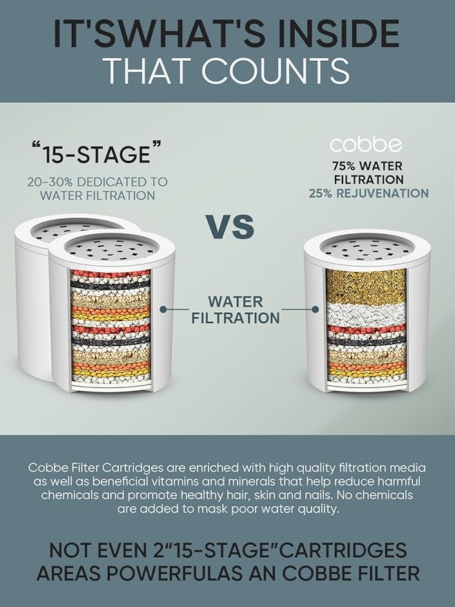 - 75% WATER FILTRATION: Cobbe filters are 75% calcium sulfite pellets and KDF-55 (not cheap beads), which effectively filter heavy metals and chlorine from water and protect your skin and hair.