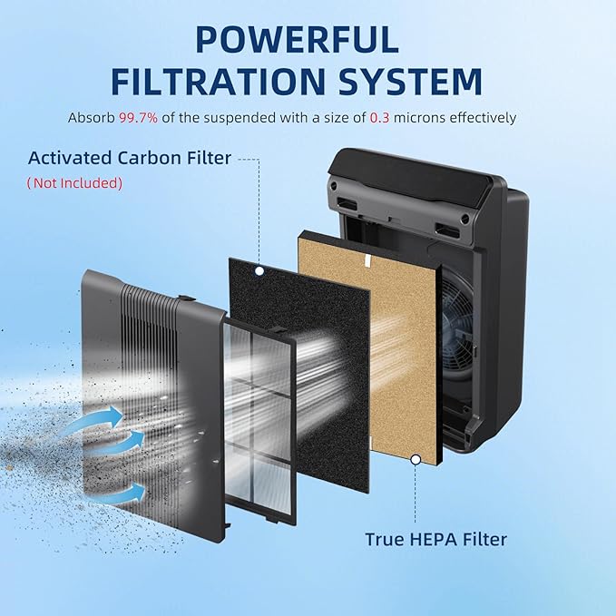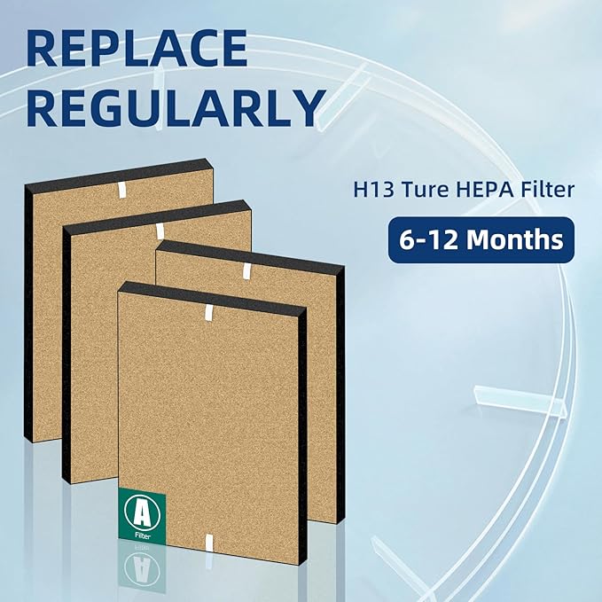 - 【REPLACEMENT FREQUENCY】 For optimal performance, it is recommended to change the True HEPA Filter once every 12 months and the Carbon Filter once every 3 months. Easy to replace and disposable, no tools required. Just attach the prefilter to the frame and pop it into your air cleaner