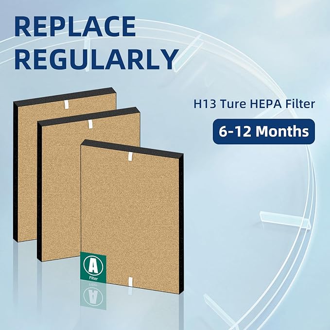 - 【REPLACEMENT FREQUENCY】 For optimal performance, it is recommended to change the True HEPA Filter once every 12 months and the Carbon Filter once every 3 months. Easy to replace and disposable, no tools required. Just attach the prefilter to the frame and pop it into your air cleaner