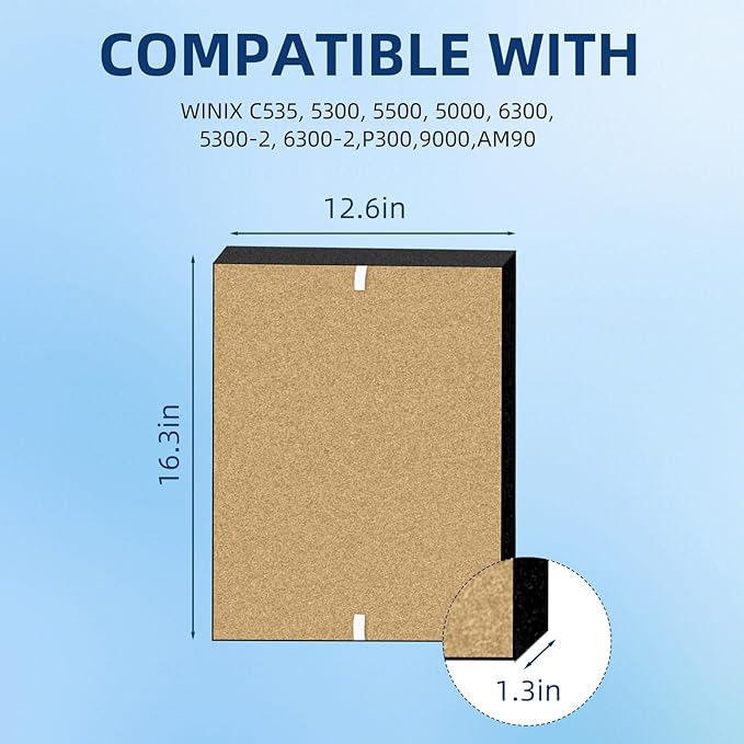 - PERFECT COMPATIBILITY】 Replacement Filter A 115115, includes 2 true HEPA filter and 8 carbon pre-filters, exactly fits air cleaner models: C535, 5300-2, 6300-2, WAC5300, WAC5500, WAC6300, 5000, 5000b, 5300, 5500, 6300 & 9000, 6300, P300, AM90 plasmawave air purifiers, True hepa filter measures: 16.3"x L: 12.6" x W 1.2". Please note: this hepa filter does NOT fit MODEL C545