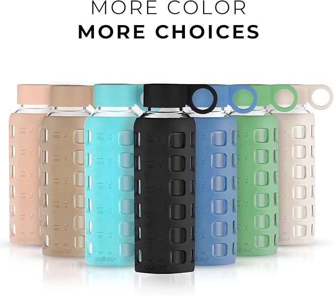 - Track & Improve Daily Hydration: Stay on top of your water goals with purifyou glass water bottles featuring clear, easy-to-read time and volume markings. Perfect for workouts, travel, the office, or relaxing at home.
