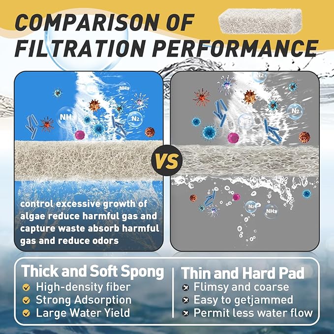 - Harmful Substance Removal: Our filter pads utilize fine sponge filtration technology to remove harmful substances from your aquarium water. Say goodbye to ammonia buildup, as the pads efficiently reduce ammonia levels, promoting a safe and thriving aquatic environment
