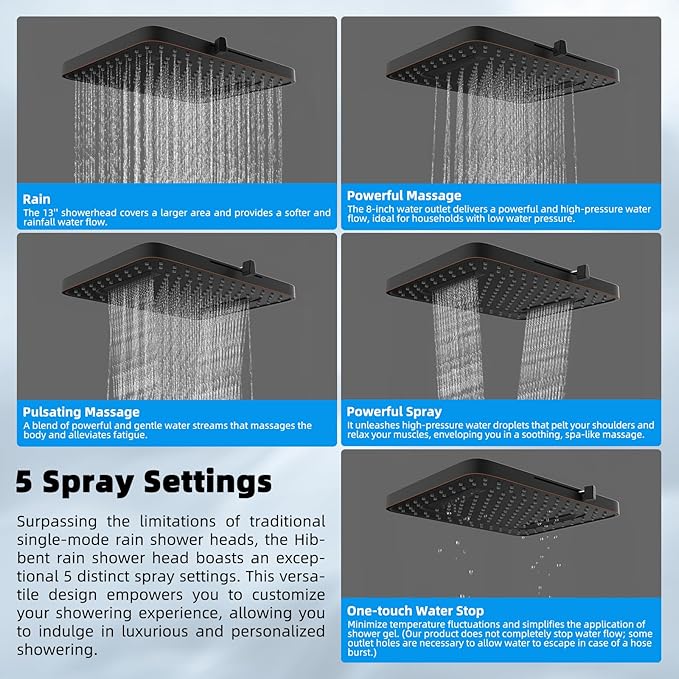 - High-pressure 5 Settings Shower Head: The shower head surpasses the limitations of traditional single-mode shower heads by offering 5 spray settings. The rain mode covers a larger area and provides a softer water flow. The powerful massage has an 8-inch water outlet, delivering a strong water impact. The pulsating massage helps alleviate fatigue. The powerful spray massages the shoulders. The one-touch water stop minimizes temperature fluctuations and simplifies the application of shower gel