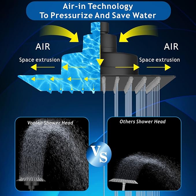 Voolan Rain Shower Head with Filtered - High Flow Large Rainfall Shower Heads Made of Stainless Steel - Waterfall Showerhead Filter For Hard Water(8" Matte Black)