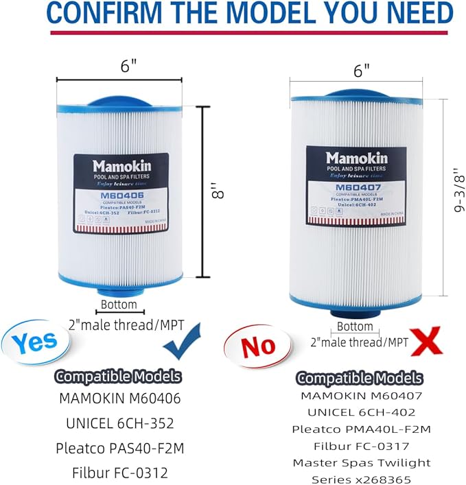 - 【Compatible Models】:Mamokin M60406 Compatible with PAS40-F2M,Unicel 6CH-352, Filbur FC-0312, Master Spas PMA-R1/X268546 with Closed Handle(Not be Removed), Artesian Spas 06-0014-12,06-0055, 2" MPT/Male Thread Spa Filter Cartridge.NOTE: All trademark remain the property of their respective holder(s) and are used for compatibility information only. MAMOKIN is an independent brand.