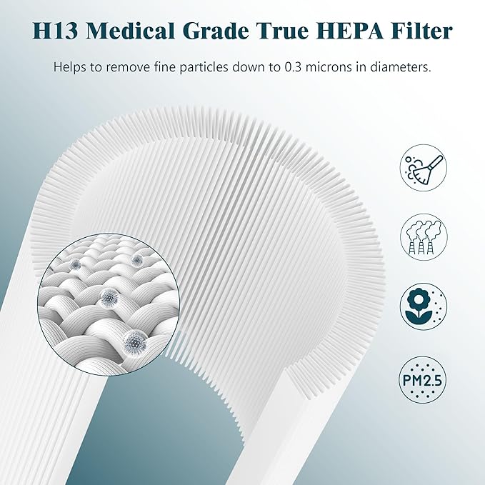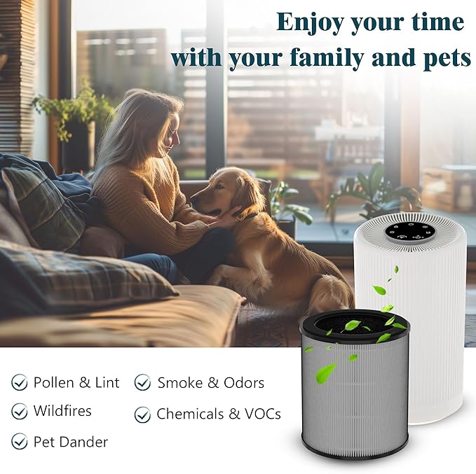- 3 Stages of Filtration:Equiped with a high effiency 3-stage filtration system, the PM1005 air purifi-er can efficiently absorb most of airborne particles from your honme or office such as pet dand-er ,lint and hair.Cleaning the pre-filter with a vacuu-m clean-er will help to extend the life of the premium filter.Note:please take off the plastic bag before replacing the filter