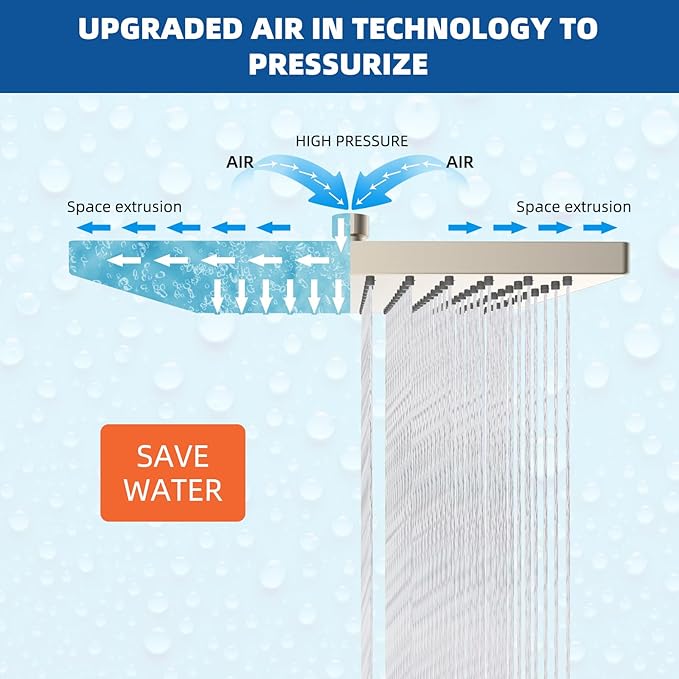- High Pressure Shower Head: The Hibbent 10-inch shower head, with its air-in technology, provides a luxurious rain-like spray that envelops the body in a soothing, enveloping downpour. This dynamic, high-pressure massage experience is delivered even at low water pressure levels, while the brushed nickel finish adds a sleek, modern elegance to your bathroom's decor