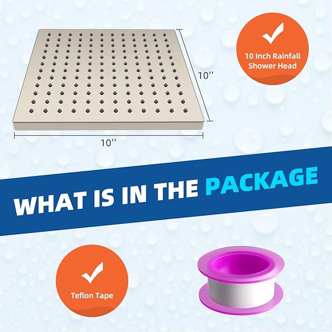 - High-quality Material: The Hibbent 10-inch rainfall shower head showcases a substantial, artfully crafted body moulded from high-quality ABS plastic, complemented by a sleek back panel crafted from certified SUS 304 stainless steel. This thoughtful material composition not only ensures the fixed showerhead is rustproof, lightweight, and built to withstand the rigours of daily use, but also lends an excellent elegance and exceptional durability that will serve you faithfully for years to come