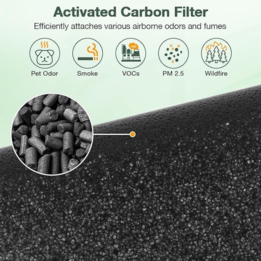 - 【Activated Carbon Filter】Upgraded granular activated carbon physically attaches unwanted odors and fumes, such as smoke, cooking odors, pet odors, VOCS, etc. Great for families with children and pets.